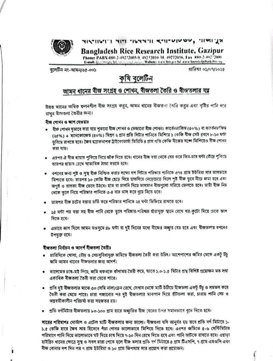 | ৪ | আমন ধানের বীজ সংগ্রহ ও শোধন, বীজতলা তৈরী ও বীজতলার যত্ন সংক্রান্ত বিশেষ বুলেটিন | | | ২৫-০৬-২০২৫ | দেখুন |
